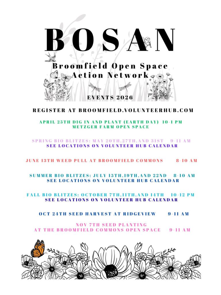 Broomfield Open Space Action Network (BOSAN) was created to engage the community in caring for Broomfield’s open spaces. It is a collaborative effort with the City and County of Broomfield, the Broomfield Open Space Foundation, the Urban Prairies Project of the Butterfly Pavilion, the Bird Conservancy of the Rockies, and Colibri Creative Conservation Solutions.
